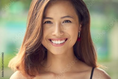 woman, young, beautiful, standing, attractive, brunette, outdoors, face, look, asian, vietnamese, flawless, honed, gorgeous, smiling, cheerful, dental, skin, happy, closeup, female, joyful, 20s, girl, lovely