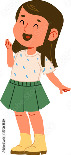 girl, children, smile, laughter, joy, happiness, playful, skirt, shirt, boot, hair, pose, cheerful, fun, character, young, expression, lively, animated, children, fashion, clothing, style, youth, friendly, happy, standing, casual attire, joyful, carefree, cute, charming, adorable, sweet, innocent, delightful, personality, vibrant
