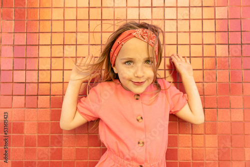 smiling, girl, hand, raised, standing, wall, copy space, 1, people, children, elementary, spain, outdoors, day, headband, cute, caucasian, lifestyle, female