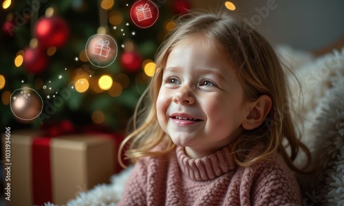girl, smile, christmas, new, year, tree, gift, icon, pictogram, around, head, festive, background, garland, dream, holiday, expectation, cosy, hope, toy, sweater, light, bokeh