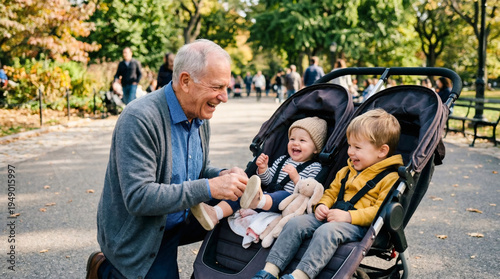 Smiling grandfather kneeling in front of a double stroller and playing with two small children in a city park. Happy family lifestyle, joy of parenthood and bonding during autumn walk.