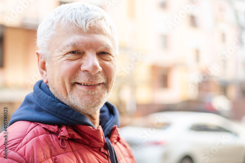 Smiling gray-haired elderly man against backdrop of beautiful urban houses.