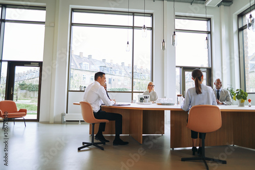 Smiling group of diverse businesspeople having a boardroom meeti