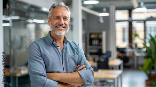 Smiling handsome businessman with crossed arms in modern office, middle-aged gray-haired man exuding confidence, business success concept.