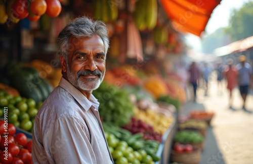 Smiling Indian man, middle-aged vendor, offers fresh produce at vibrant outdoor market stall. Colorful vegetables, fruits fill display, suggesting abundance, healthy eating. Livelihood relies on