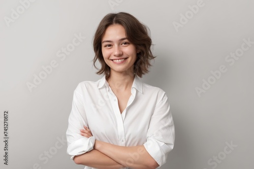 Smiling individual with folded arms, white shirt on grey background
