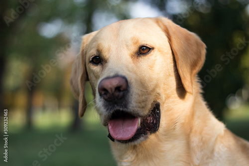 Smiling labrador dog in the city park portrait. Smiling and looking up, looking at camera