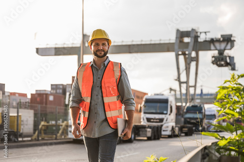 smiling, logistic, men at work, walking, tablet, industrial, district, sunny, technology, 1, people, industry, computer, communication, adult, business, man, digital, outdoors, occupation, job, working, freight, traffic, good, transport, expertise, global, globalisation, hard, hat, helmet, connection, wireless, area, light, sunlight, reflective, vest, safety, protective, clothing, service, caucasian, road, looking, delivering