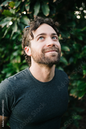 admire, agriculture, beard, blurred background, casual attire, confident, countryside, cultivate, curly hair, delight, enjoy, farm, farmer, farmland, foliage, fresh, garden, gardener, greenery, growth, guy, happy, horticulture, human face, looking up, lush, male, man, nature, optimist, outdoors, plant, plantation, portrait, positive, satisfied, small business, smile, summer, sunlight, tree, vegetate, vertical, young
