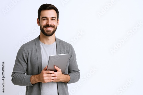 smiling, man, holding, digital, tablet, modern, business, isolated, background, device, happy, technology, white, professional, person, male, adult, studio, portrait, looking, camera, grey, cardigan, casual attire, lifestyle, confident, positive, communication, online, connection, network, wireless, application, app, user, interface, screen, blank, copy, space