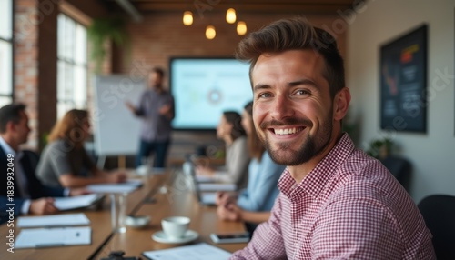 man, smiling, business, meeting, confidence, teamwork, professional, positivity, beard, young, collaboration, workplace, discussion, engagement, leadership, atmosphere, sharpened, success, communication, strategy, presentation, corporate, interaction, friendly, motivation, idea, smiling face, business attire, productivity, connection, inspiration, cheerful, conference, brainstorming, meeting room