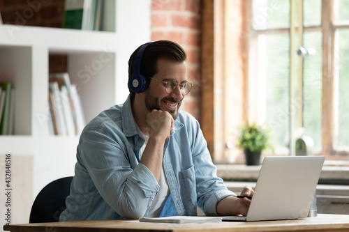 Smiling man in glasses and headphones looking at laptop screen, sitting at wooden desk, happy motivated student watching webinar, involved in online course, listening to lecture, studying at home
