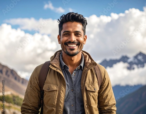 man, smile, happy, mountain, travel, adventure, hiking, portrait, person, outdoors, smiling, face, landscape, nature, cloud, sky, sharpened, brown, jacket, shirt, beard, hair, male, image, cheerful, tour tourism