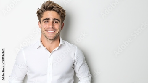 Smiling Man in White Shirt Portrait Studio shot, close-up, happy expression, copy space. Portrait Photography, Business Casual