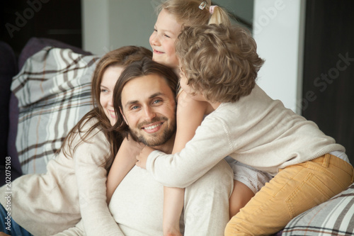 Smiling man looking at camera enjoying kids and wife embracing dad, happy loving family parents and children having fun bonding together on sofa hugging congratulating daddy with fathers day at home