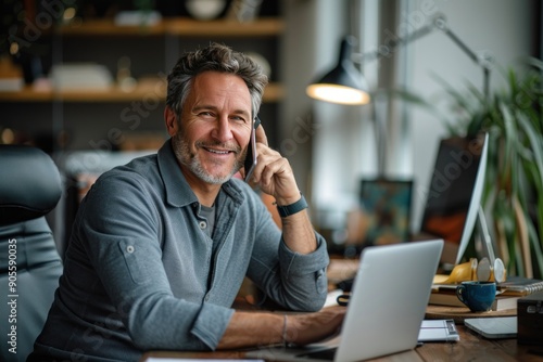 man, smiling, office, phone, desk, laptop, work, business, professional, modern, grey, shirt, table, call, conversation, technology, computer, typing, keyboard, screen, wireless, earphones, hot drink, cup, blue, book, paper, light, window, chair, black, background, interior, sharpened, happy, concentrated