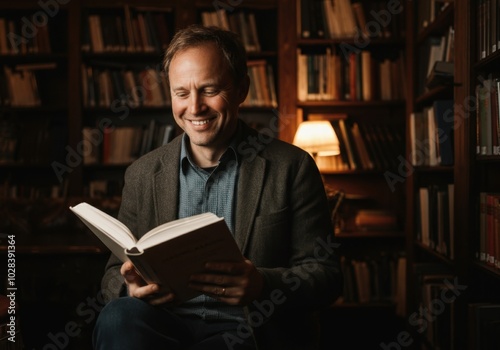 smiling, man, reading, book, library, cosy, literature, shelf, lamp, warm, happiness, learning, cognition, study, focused, concentration, casual attire, relaxed, intellectual, wisdom, education, enjoyment, leisure, peaceful, serene, comfortable, ambient, discovery, bookshelf, understanding, curiosity, imagination, storytelling, inspiration, expression, thoughtful, academic, engaging, culture, bookworm, nirvana, journey, atmosphere