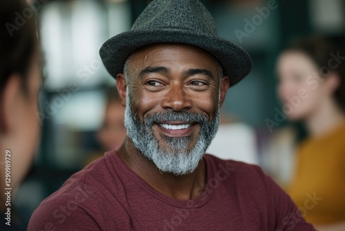 Smiling man with beard wearing hat, radiating warmth in lively c
