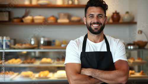 man, male, person, face, portrait, bakery, counter, shop, cafes, store, retail, owner, entrepreneur, business, smiling, happy, cheerful, confident, young, horizontal, indoor, barista, food, looking, caucasian, employee, staff, arms crossed, market, eatery, baker, pastry, bread, sweet, dessert, epicure, delicious, fresh, baked, pastry shop, smiling face, service, profession, occupation, lifestyle, client