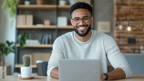 Smiling man with glasses working laptop modern office environment, showcasing positive attitude
