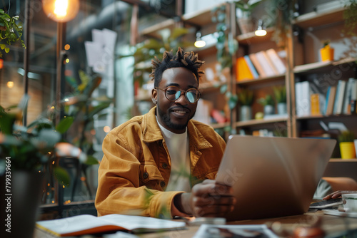 man, goggles, smiling, laptop, working, happy, business, technology, entrepreneur, office, computer, cyberspace, african, browsing, web, digital, cheerful, african american, professional, male, eyewear, spectacle, joyful, casual attire, software, developer, programmer, coding, programming, datum, analysis, online, connection, network, communication, modern, young, adult, tied-up, concentration, focused