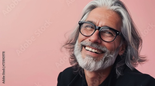 Smiling man with gray beard and hair wearing black glasses against pink background.