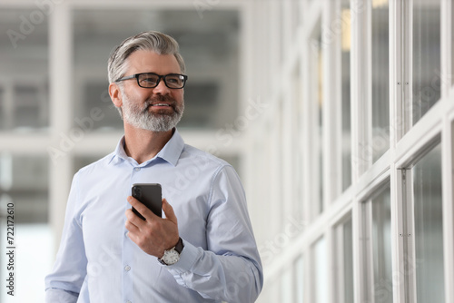 Smiling man with smartphone in office, low angle view. Lawyer, businessman, accountant or manager