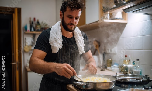 smiling man with tea towel on shoulder cooking in his apartment kitchen.