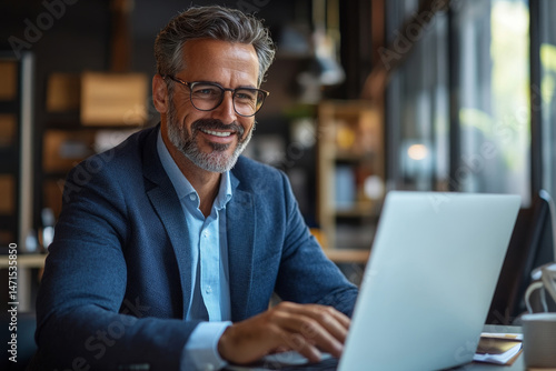 Smiling mature adult business man executive sitting at desk using laptop. Happy busy professional mid aged businessman ceo manager working on computer