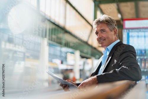 smiling, mature, businessman, newspaper, station, platform, copy space, 1, people, travel, adult, business, man, male, manager, entrepreneur, suit, bench, reading, sitting, waiting, life events, city, urban, train, light, beam, sunbeam, outdoors, optimistic, trip, self-confidence, contemplation, journey, confidence, news, thinking, commuter, traveler, caucasian, german, sunlight, emotion, looking