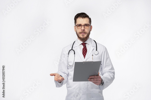 doctor, stethoscope, portrait, man, person, medicals, isolated, hospital, white, uniform, job, health, people, occupation, adult, medicine, care, young, background, profession, men at work, health care, specialist, professional, clinic, friendly, happy, student, male, work, standing, attractive, confident, smile, medic, physician, caucasian, photogenic, working, single, treatment, practitioner, healthy, smiling, folder, nurse, business, sick, grey, human