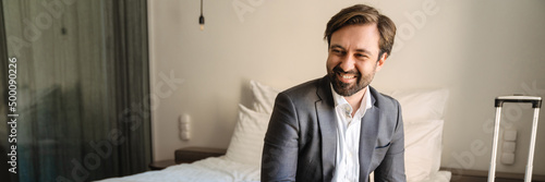 panorama, panoramic, cropped, man, adult, young, white, to sit, drink, cup, bed, room, hot drink, hotel, businessman, baggage, formal, tea, smile, day, indoor, baggage, beverage, happy, 1, positive, people, business, travel
