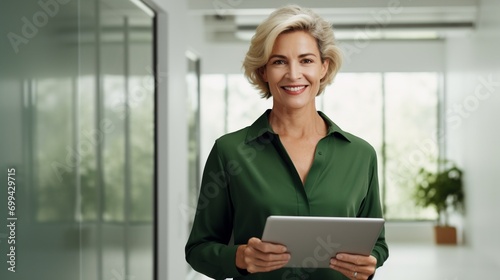 Smiling mid aged mature professional business woman in forest green blouse, 40s female executive or entrepreneur holding fintech tab digital tablet standing in office at work, large window copy space