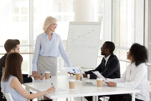 Smiling middle aged businesswoman stand holding business meeting with young colleagues, friendly female mature boss talk with employee, diverse millennial workers briefing in office discussing project