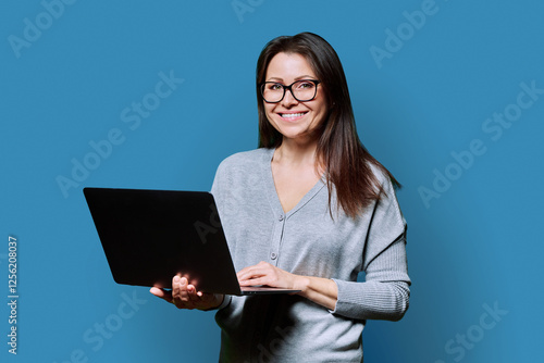 Smiling middle aged woman holding laptop on blue background
