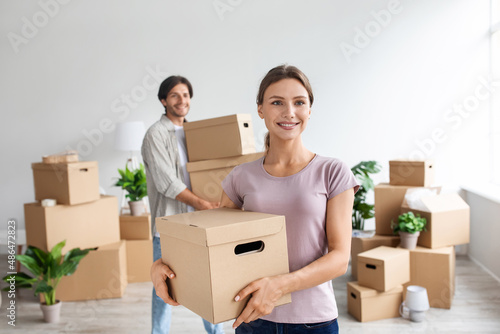 Smiling millennial caucasian lady and guy in casual clothes carry cardboard boxes with belongings in room interior