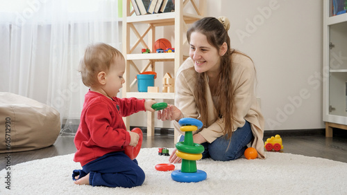 Smiling mother playing with her baby son on carpet and giving him colroful toys