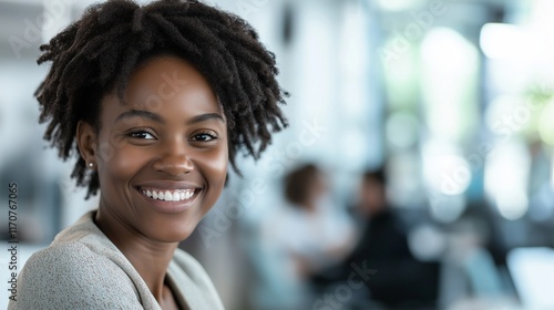 Smiling person brainstorming in a modern coworking space, with sticky notes, laptops