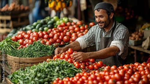 market, seller, produce, tomatoes, vegetable, fresh, food, selling, merchant, daylight, happy, smiling, man, business, agriculture, local, farmers market, healthy, red, green, basket, stall, display, buying, trade, commerce, economy, lifestyle, culture, street, urban, city, community, shopping, client, interaction, portrait, daytime, vibrant, colourful, active, working, occupation, profession, people, human, adult