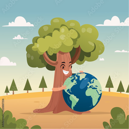 Smiling planet Earth hugging a tree