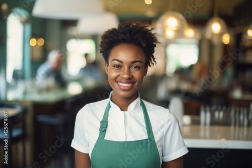 people, waitress, young, female, african american, smiling, portrait, cafes, eatery, hospitality, service, uniform, professional, friendly, customer service, work, occupation, business, entrepreneur, food industry, barista, server, cafes, dining, indoor, workplace, staff, teamwork, engagement, welcoming, expertise, life events, interaction, communication, modern, trendy, contemporary, urban, energy, productivity, career, aspiration, motivation, confidence, success, equity, inclusion, diversity, lifestyle