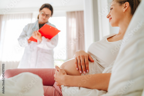 smiling, pregnant, woman, lying, bed, doctor, 2, people, adult, day, home, interior, patient, disease, health care, medicine, female, medicals, occupation, job, men at work, nursing, staff, call, exam, treatment, mid, mature, pair, anticipation, service, caucasian, lifestyle, pregnancy, visit, event