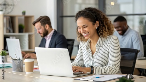 woman, laptop, working, smiling, colleague, office, teamwork, productivity, professional, workspace, modern, corporate, collaboration, sharpened, digital, job, happy, career, success, technology, planning, multitask, organisation, management, efficiency, workday, workplace, communication, positive, team, active, innovation, professional woman, leadership, relaxed, engaged, motivated, desk