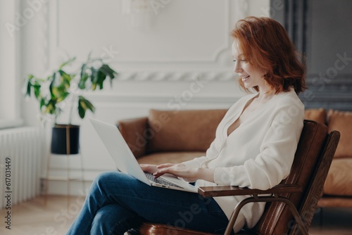 Smiling redhead freelancer in armchair, typing on laptop, uploading materials for site development, in modern apartment, connected to Wi-Fi.