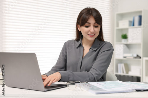 Smiling secretary working with laptop at table in office