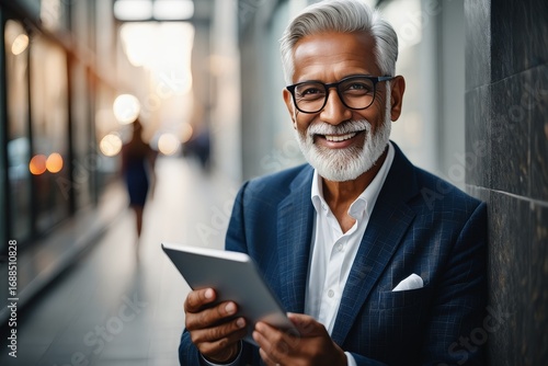 senior, man, businessman, male, tablet, technology, business, smiling, portrait, urban, city, professional, modern, grey hair, beard, goggles, elegance, mature, successful, generation, lifestyle, digital, device, communication, finance, consulting, leadership, confidence, ethnicity, diversity, multicultural, elegant, corporate, workplace, innovation, contemporary