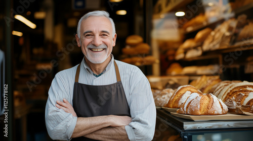 Smiling senior male standing in front of bakery