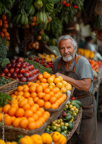 seller, market, fruit, fresh, produce, senior, man, smiling, stall, vegetable, healthy, eating, local, food, organic, tomatoes, strawberry, citrous, grape, apricot, green, retail, sale, nourishment, farmer, business, small business, shop, portrait, customer service, cheerful, agriculture, grocery, health, wellness, variety, abundance, selection, commerce, trade, buying, selling, apron, work, lifestyle, mature