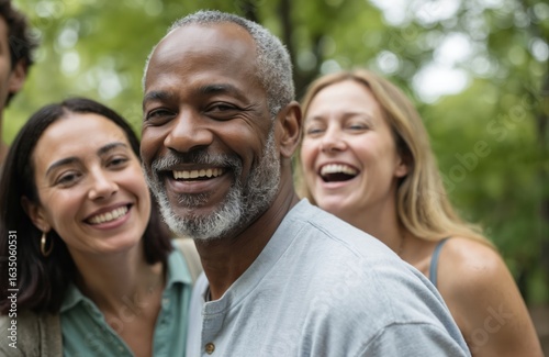 Smiling senior man with friends in park background. Diverse group, aged 50s plus, enjoying outdoor leisure. People share laughter, happiness, connection. Captures relatable moments of friendship,