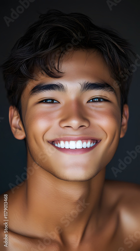 Smiling South East Asian young adult boy portrait with a joyful and uplifting expression on a clean backdrop